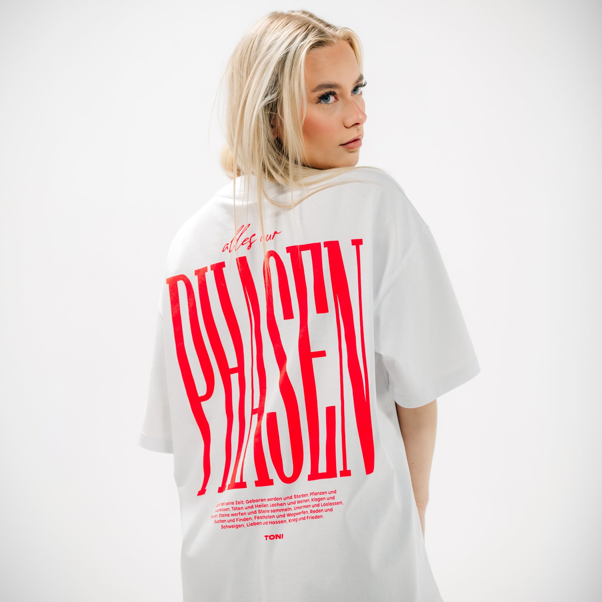 Ein saubequemes Shirt mit 200 GSM, extra dickem Rundkragen und fettem, rotem Backprint in lässigem Oversize Fit: Genau so, wie TONI es am liebsten trägt.
